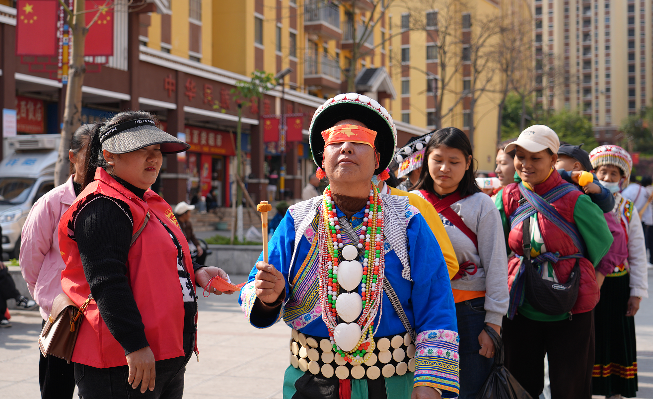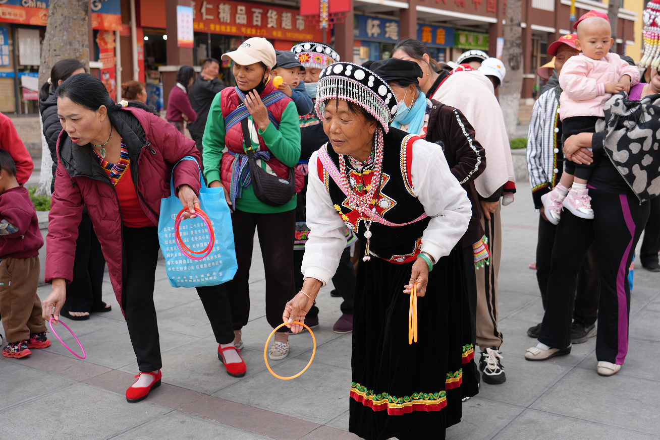 文艺演出结束后,充满趣味的游园活动随即展开。活动现场设置了蒙眼敲锣、套圈、海底捞月等小游戏,“蒙眼敲锣”需要参与者蒙着眼睛精准敲响悬挂的铜锣,参与者自信走“歪”的步伐,引得现场观众捧腹大笑。与此同时,“套圈”区也排起了长队,居民们手持彩色套圈,瞄准靶心,势在必得。活动现场,每个游戏区都围满了人群,大家玩得不亦乐乎。
