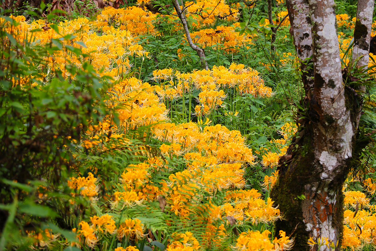 在一处小台地上,金黄色的彼岸花正灼灼燃烧。余发祥说,这个位置,当年牺牲了很多远征军,听说将士遗体整整堆了七层。山风呼啸,花浪翻滚如泣如诉,恍惚间似有炮火声破土而出,须臾又消散于林涛之中。